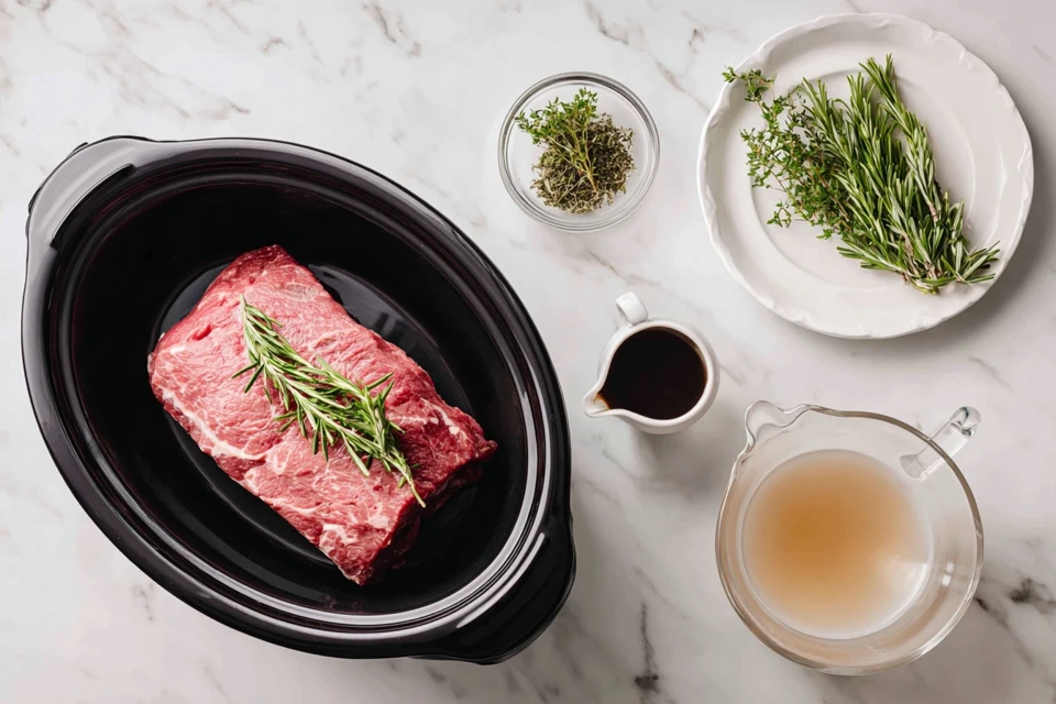 Mix beef broth, Worcestershire sauce, minced garlic, thyme, and rosemary in a bowl