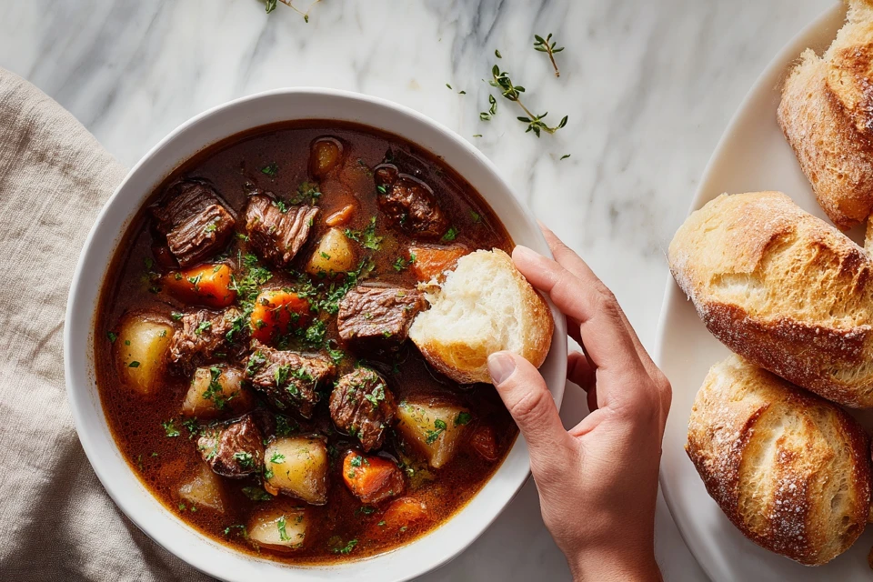 - Serve hot with crusty bread for soaking up the gravy Spoon over mashed potatoes or egg noodles Garnish with fresh parsley Pair with a robust red wine Add a side of crusty French bread